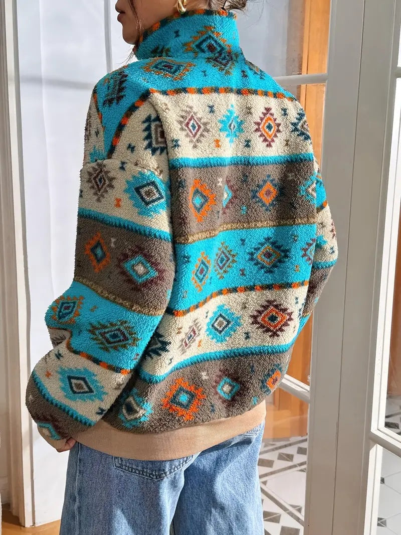 Make a bold statement with the Azara Pullover Fleece Jacket, where cozy comfort meets vibrant personality. Featuring a rich Southwestern-inspired pattern in earthy tones and striking turquoise accents, this piece adds a touch of artistry to your cold-weather wardrobe. Designed with a relaxed fit and a half-zip neckline, it offers just the right blend of warmth and breathability for everyday wear. The eye-catching design brings effortless flair to any outfit, whether paired with denim or layered over basics. From weekend adventures to casual days out, the Azara keeps you feeling warm, confident, and unapologetically unique.