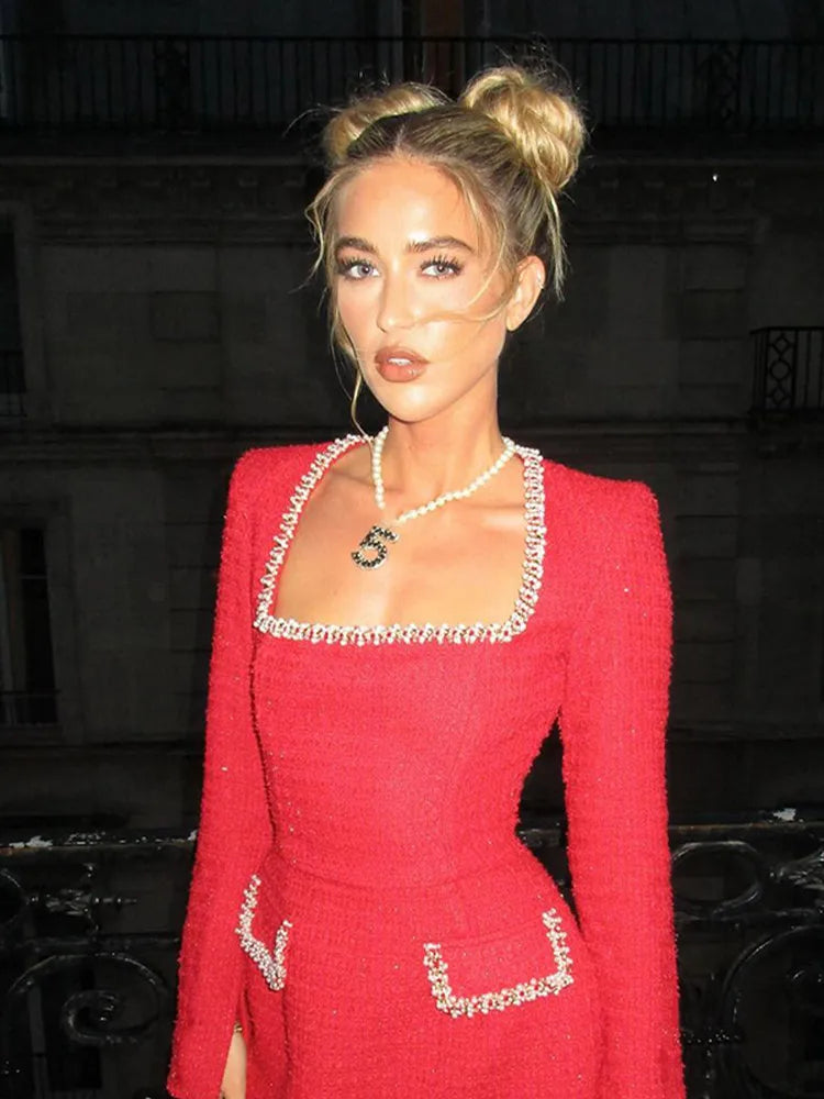 Step into timeless style with the Jolene Tweed Mini Dress, a perfect fusion of grace and modern flair. Made from luxurious tweed fabric, this mini dress features a striking square neckline and long sleeves, embellished with delicate pearl trims. Whether it's a special occasion or an evening out, this dress promises to elevate your wardrobe with a touch of refined sophistication.